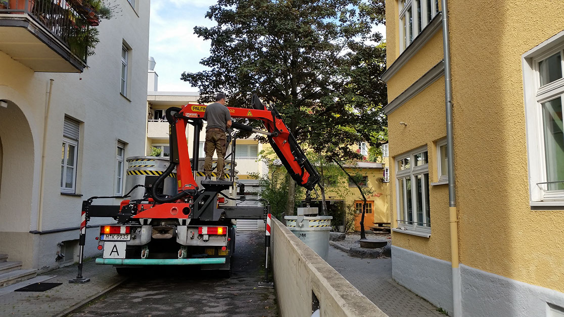 Anlieferung von Baumaterial wie Sand, Kies etc. und Abholung von Abfällen im selben Container